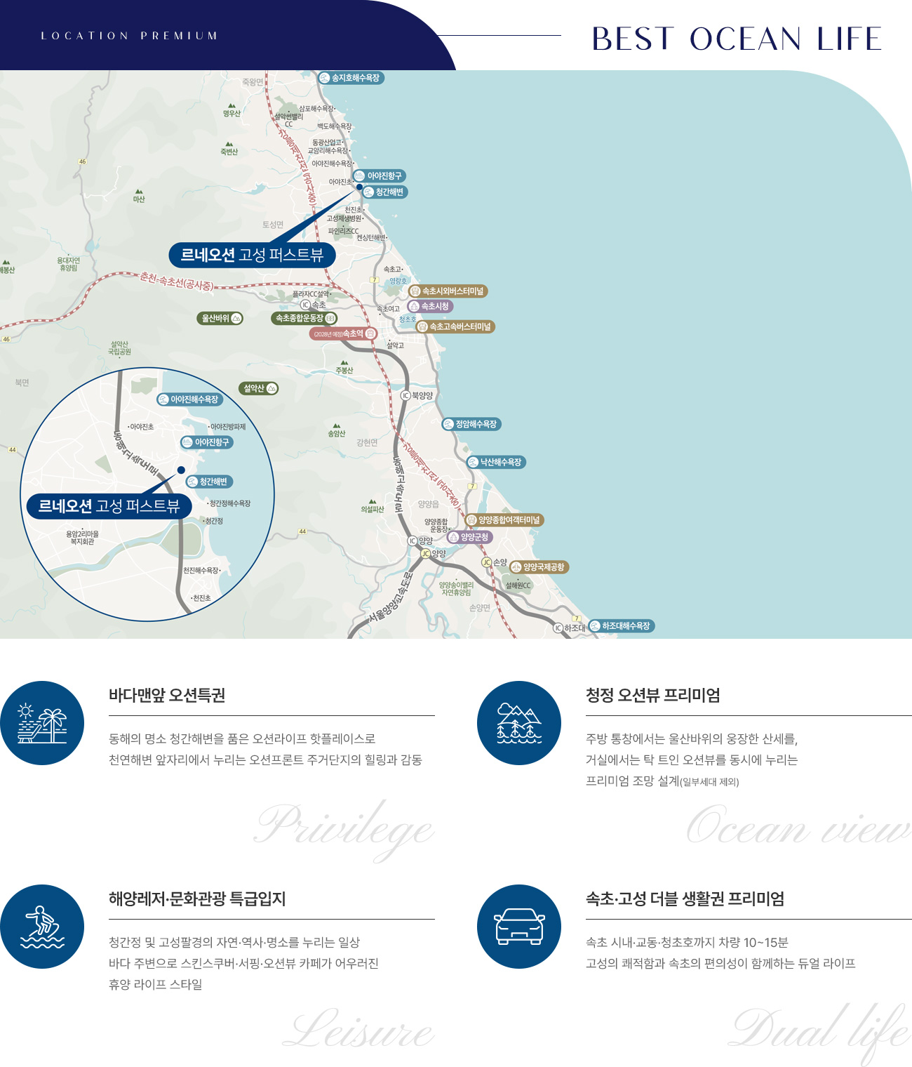 본 홈페이지에 표기된 지역명소와 생활인프라 및 각종 교통시설의 거리, 이동시간은 다음과 같습니다.(네이버지도 직선거리 및 소요시간) 청간정해수욕장 50m 도보 1분, 아야진초등학교 590m 도보 8분, 편의점 40m 도보 1분, 하나로마트 325m 도보 4분, 7번국도 96.5m 차량 1분, 동해고속도로 속초IC 7.8km 차량 12분, 서울양양고속도로 양양IC 22k.8m 차량 23분, 설악산 초입 7.6km 차량 10분